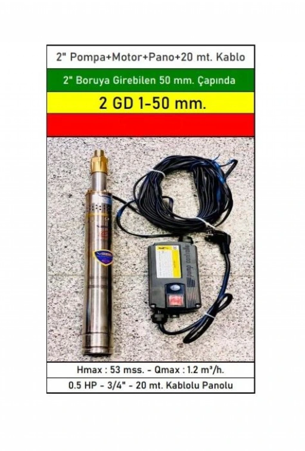 Vortex 2GD1 50mm Çapında 0.5HP 220V 20mt Kablolu Panolu Dalgıç Pompa, 2" boruya girebilir Hmax:53mss Qmax:1,2ton/saat 0,5hp 3/4" çıkışlıdır. Temiz su kuyularında çalışmaya uygundur