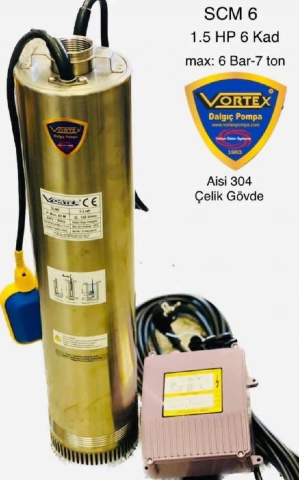 Vortex SCM 6 1.5HP Çelik Gövdeli Keson Kuyu Dalgıç Pompası, 1.5HP gücünde 220V ile çalışır, Çıkışı 1 1/4" tir. 10mt kablolu açma kapama ve termik koruma panolu, 6 kademeli noril fanlıdır. Kendinden Flatörlüdür su bittiği zaman otomatik durur. Açık Geniş Keson derin kuyularda kullanımı uygundur, Basınçlı pompa olduğu için uzun mesafelere su aktarabilirsiniz, bahçe sulama için fıskıye sistemlerinde de kullanılır.