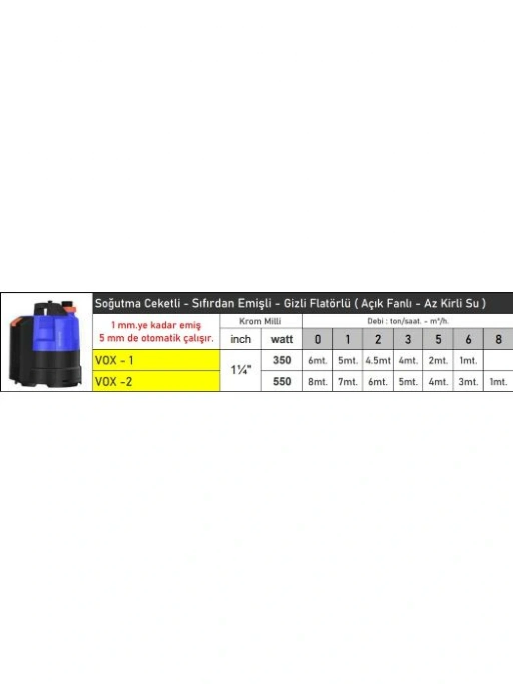 Vortex VOX-2 Sıfırdan Emişli Gizli Flatörlü 220V Dalgıç Pompa, 550w gücündedir, 10mt kablolu, gizli flatörlü, su azaldiği zaman otomatik durma, su seviyesi yükseldiği zaman otomatik çalışma özelliği vardır. Açık kanatlı olma özelliği ile fanda tıkanma olmaz, sızıntı sularını atmaya uygundur. Max:8,5mt dik yüksekliğe su aktarabilir. 5,5mt ye saatte 4,3 ton 3mt ye saatte 6ton su aktarabilir