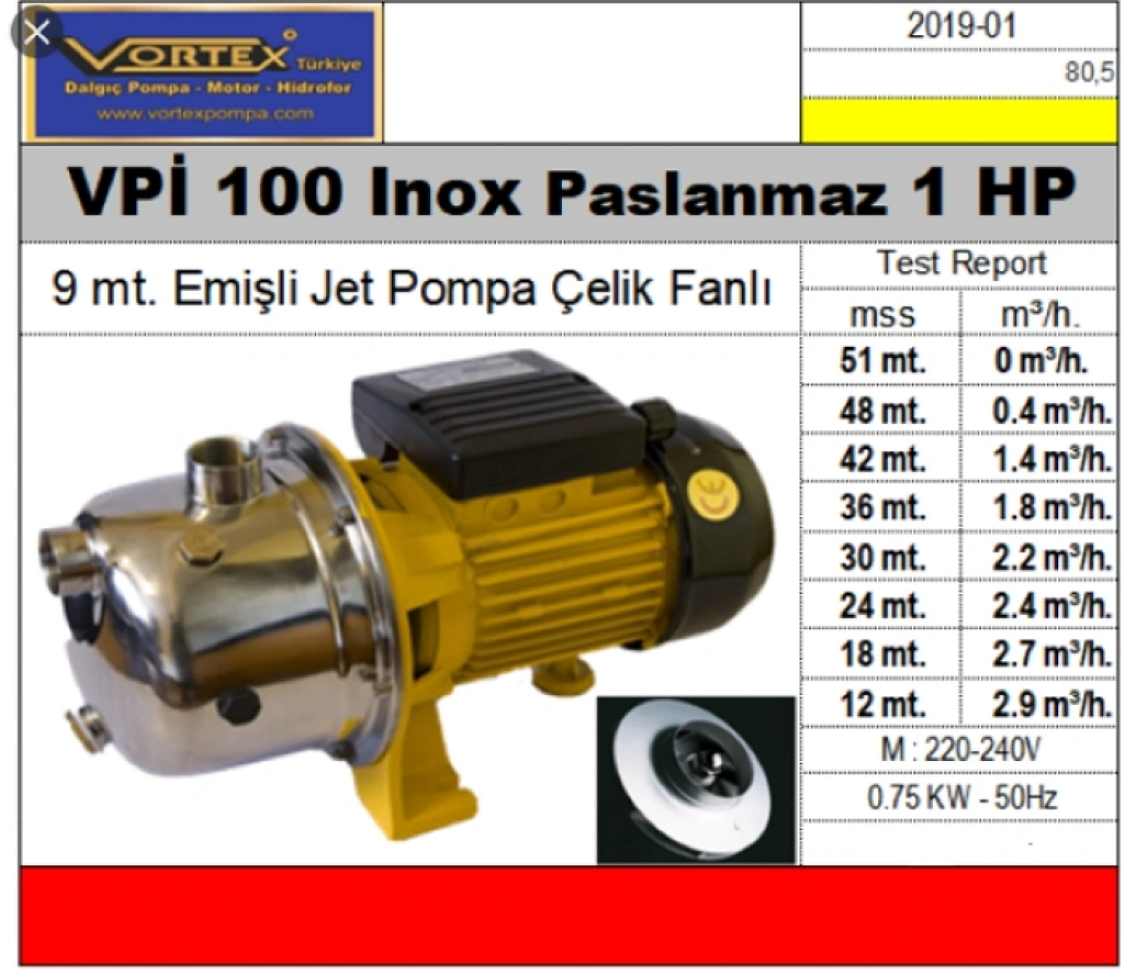 Vortex VPİ 100 inox s/s 304 1Hp 220v Paslanmaz Gövde Çelik Fanlı Jet Su Pompa, bıkır sargılı bobinler termik korumalıdır. Aisi 304 krom millidir, 1" giriş çıkışlıdır, 9mt den emiş yapabilir, max:50mt dik su atabilir, 44mt ye 0,8ton 33mt ye 2ton 13mt dik mesafeye saatte 3,2ton su aktarabilir