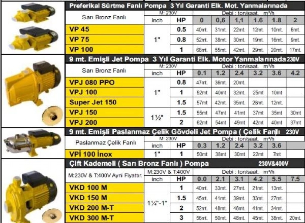 Vortex VPJ 100 Ultra Jet 1Hp 220v Döküm Gövdeli Jet Pompa, bıkır sargılı bobinler termik korumalıdır. Aisi 304 krom millidir, 1" giriş çıkışlıdır, 9mt den emiş yapabilir, max:50mt dik su atabilir, 45mt ye 0,8ton 34mt ye 2ton 16mt dik mesafeye saatte 3,2ton su aktarabilir
