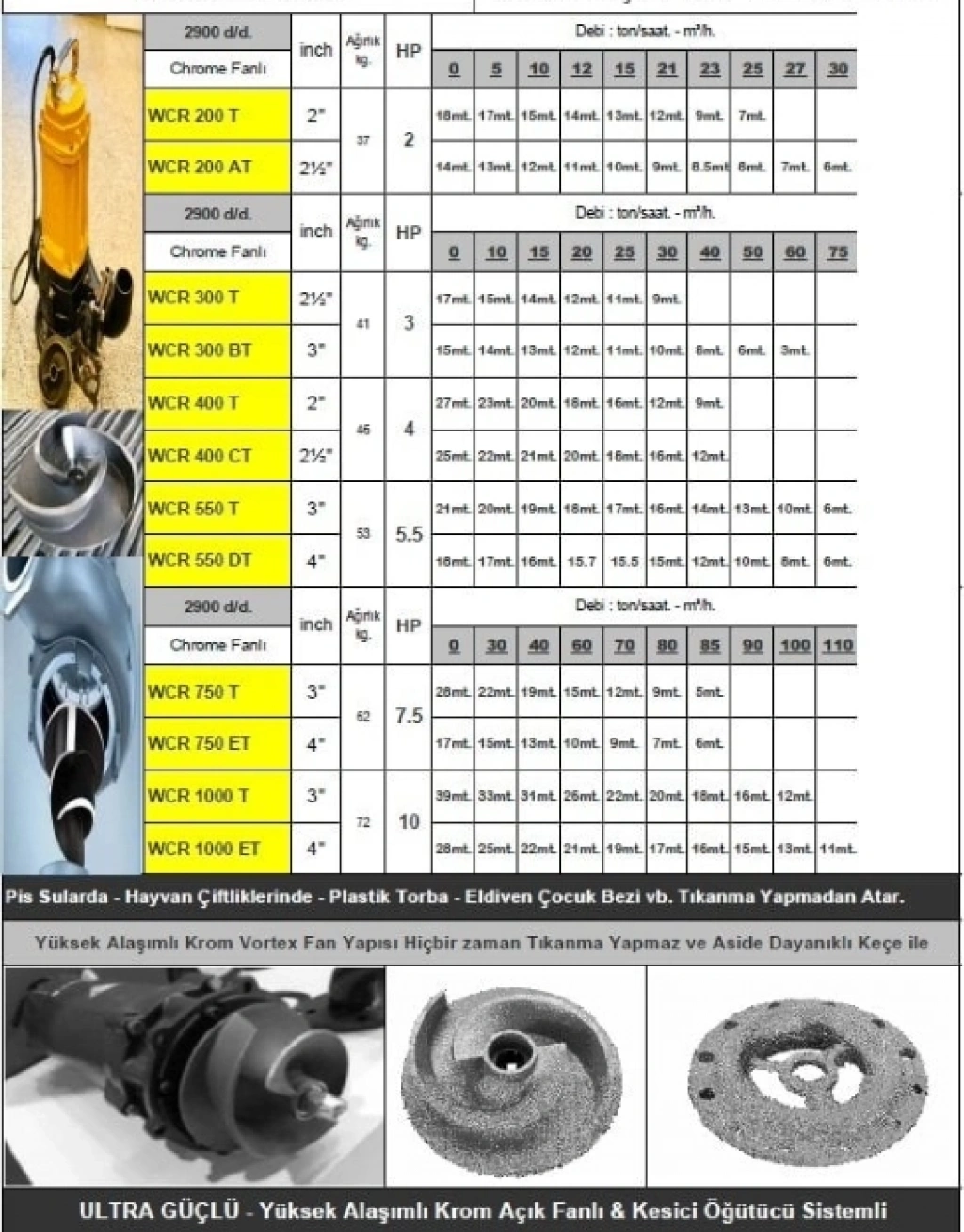 öğütücülü olduğu için tıkanma yapmaz. Kirli pis sularda, foseptik kuyularında, hayvan çiftliklerinde kullanımı uygundur. Konik fan yapısıyla plastik torba eldiven çocuk bezi gibi maddeleri öndeki sabit kesici bıçaklar ile öğüterek kuyudan atılmasına yardımcı olur. Pompa ağarlığı 53kg dır.